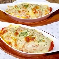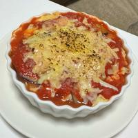 - 4 耐熱皿に3、トマトソース、ピザ用チーズの順に重ね、同様に2回くり返します。