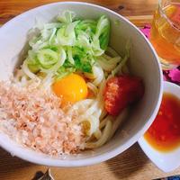 冷凍うどん簡単で便利ですね。高菜やシラス、海苔ものせて具沢山に仕上げてみました。醤油はだし醤油でひと回し。