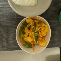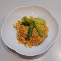 ハムのかわりに、魚肉ソーセージで作りました。この時期ならではのメニューですね。溶き卵に塩コショウして最後に黒胡椒振りました。魚肉ソーセージの味がしっかりしてるから、これでじゅうぶん。