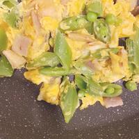 スナップえんどうと卵のふんわりマヨネーズソテーのご紹介です。マヨネーズを使って炒めているので、ふんわり卵の食感を楽しむことができます。ハムの旨味、スナップえんどうの甘味を感じる優しい味の一品です。ぜひ、お試し下さい。