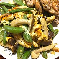 スナップえんどう、しめじ。マヨネーズのコクとスナップえんどうがとても合います。マヨネーズのおかげでたまごもふんわり。