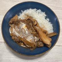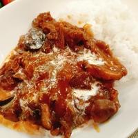 薄切りラム肉使用、椎茸の代わりにブラウンマッシュルームとエリンギたっぷり、赤ワイン倍量くらい、ケチャップ→トマトペースト、中濃ソース→ウスターソース、コンソメ→玉ねぎ麹に変更、生姜は無し。