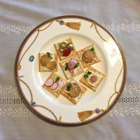 - 2 クラッカーに、クリームチーズ、1をのせます。