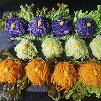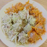 - 2 キャベツ、紫キャベツ、ニンジンは千切りにし、それぞれに塩少々をまぶし、水気をしぼります。