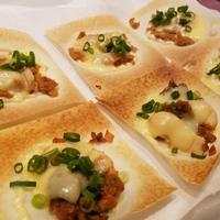 - 4 3に1、2、ピザ用チーズを乗せ、トースターで4分焼き完成です。
