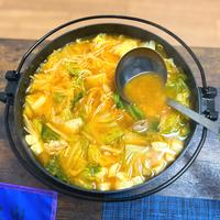 鶏もも肉とキャベツの甘みが際立つ優しい味わいの鍋料理です。キムチの辛さはマイルドで食べやすく、ニンニクの香りが食欲をそそります。余り野菜や舞茸、エノキ、モヤシなど好みの具材を加えても◎。野菜と鶏肉の旨味が溶け込んだスープは、豆板醤や白だしで味を調整できます。シメは中華麺やうどんが相性抜群で、寒い日に体が温まる一品です。