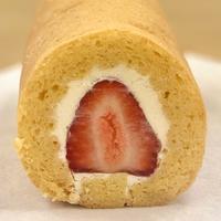 - 6 3の両端を切り落として4を塗り、ラップにのせます。5の白いホイップクリームを奥3cmを残して塗り、いちごを並べます。手前から奥に巻いてラップで包み、冷蔵庫で15分程冷やします。