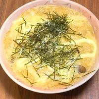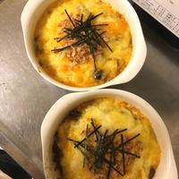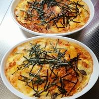 - 5 耐熱皿に1を乗せ、4をかけたらピザ用チーズ、マヨネーズを乗せます。オーブントースターで15分程焼いてのりをかけて完成です。