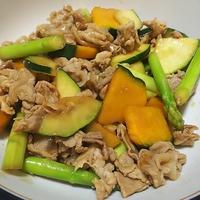 かぼちゃとズッキーニ、アスパラガスを使った甘辛い中華風の炒め物です。ジューシーな豚バラ肉とかぼちゃのこっくりとした甘じょっぱさは相性抜群です。今回は炒め物にしてもみずみずしいズッキーニと、食感が楽しいアスパラガスを合わせました。今晩のおかずにぜひお試しください。