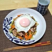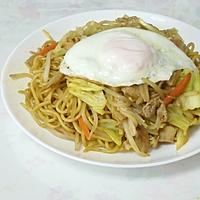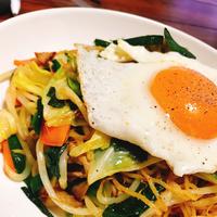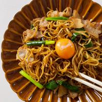 麺をカリカリに焼いた焼きそばに、カレー粉を加えてスパイシーに仕上げました。カリカリと香ばしい中華麺と、カレーの風味が効いたソースがよく合います。卵黄を絡める事で、なめらかな味わいになります。是非お試しくださいね。