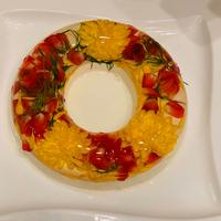 透き通ったゼリーの中に色とりどりのお花が包まれた、華やかでとってもオシャレなスイーツです。さっぱりとした白ワインの風味とクリームチーズのまろやかな風味が上品な味わいは、みんなが集まるパーティーやお祝いの日の食卓にもぴったりです。