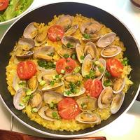 これで20cmのフライパンを使い見た目も量も満足な一人分パエリアができました。加熱時間はレシピ通りでOK。業務スーパーの冷凍あさりが砂抜き済みで使い切りパックでめちゃ便利です。