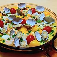 シーフードたっぷりでとっても美味しかったです。カレー粉は使わず、サフランとコンソメの代わりにフュメドポワソン使用。アサリは予めダシを取るのがポイントですね。イカとタラは最初に軽く焼いておいて、お米を炊く際にタラ、蒸すタイミングでイカとアサリを戻し入れました。水分合計400cc、煮立ったら3分→ごく弱火15分で炊き、10分蒸らしたらバッチリでした。