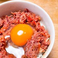 コンビーフをごはんにたっぷりとのせた、簡単丼のご紹介です。とても簡単にお作りいただけますよ。小腹が空いた時にもぴったりの一品ですよ。卵黄とよく混ぜて召し上がってください。この機会にぜひ作ってみてくださいね。