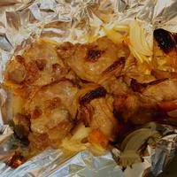 - 4 トースターの鉄板にアルミホイルをひいて、2と3を乗せたら、トースターで8分焼きます。肉に火が通ったらお皿に盛り、完成です。
