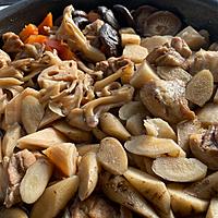 - 6 レンコンは皮をむき、縦4等分に切り、乱切りにし、1に入れます。うずら卵の水煮を1に入れます。