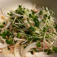 シャキシャキっと野菜の食感が美味しい、簡単サラダのレシピです。玉ねぎとツナ、かいわれ大根の相性はぴったり!ほんのり効いた生姜が食欲をそそります。必要な材料も手順も少なく、とても手軽に作ることができるので、ぜひお試しください。