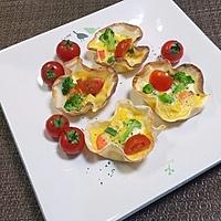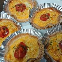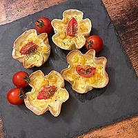 - 3 天板に餃子の皮を敷いたアルミカップをおき、2を均等に入れ、ミニトマトをのせます。