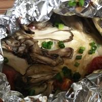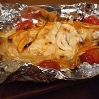 - 4 ホイルの上に2を皮を上にして置き、3をのせて横に1のミニトマトを並べます。