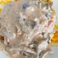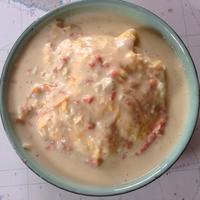 生クリームの代わりに牛乳で。少し手間はかかりますが美味しく出来ました^ ^ 全体的に1人分としては量が多かったです。