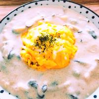 濃厚な明太子クリームソースが決め手となる贅沢なオムライスです。マッシュルーム、しめじなどのきのこの食感がアクセントとなり、ジュワッと染み出すソースがご飯に絡んで絶品。生クリームを牛乳に変えても美味しく、パスタにアレンジしても楽しめます。最後に刻み海苔をパラリと振りかけると、見た目も味も更にグレードアップ。お子様にも喜ばれる人気メニューです。
