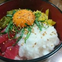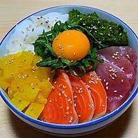 - 5 器にごはん、1、マグロ、2、めかぶを盛り付け、真ん中に3、卵黄をのせます。