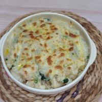 具材は家にあるもので作りました!玉ねぎ、小松菜、エビ、ベーコン、かぼちゃ、コーン入れました!牛乳は400ぐらい、コンソメはキューブ1.5くらいで丁度良かった!コーンは最後にご飯と一緒に入れて混ぜて、かぼちゃはレンチンして上に乗せて、その上からチーズで。200どのオーブン20分で予熱したけど15分でもう焼けてました!めっちゃ好評でしたー!