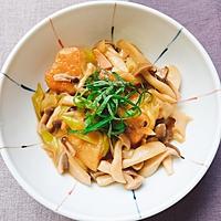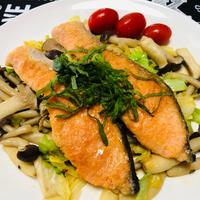 きのこと代用したキャベツを調味料で炒め鮭をのせました