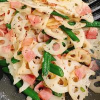 レンコンとさやいんげんにハムを加えて洋風のきんぴら風にアレンジしました。ニンニクと鷹の爪の輪切りは弱火でじっくり炒めると、旨みと辛味が引き出されます。ごはんのおかず、お酒のお供におすすめなので、ぜひお試し下さいね。