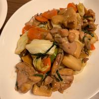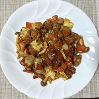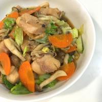 タレは半量残しておいて鶏を焼く→野菜投入して蓋してしんなりさせる→野菜の水分が出てきたら蓋を外してある程度水分飛ばす→水分が飛んだら残しておいた半量のタレ投入して味つける