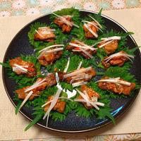 - 5 大葉に4、キムチ、1をのせ、器に並べて白いりごまを散らしたら出来上がりです。