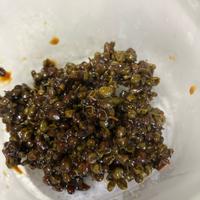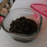 それで酒大さじ3、みりん大さじ1で洗うようにして解けたところで、更に極く弱火で5分ほどかき混ぜながら煮ましたら今度はサラサラに出来上がり、さっきより実も少し柔らかくなりました。