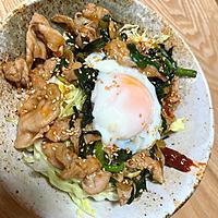 野菜不足なので下に千切りキャベツを。辛いのが好きな私は、ラー油を回しかけ、豆板醤を添えました。調味料が少ないので失敗なくていいです!