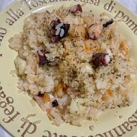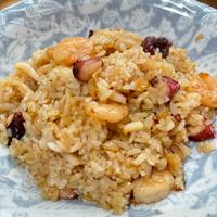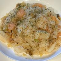 - 4 エビ、2、白ワインを入れてエビ、イカに火が通るまで中火で炒めます。残りの1を入れて炒め、ブラウンマッシュルームがしんなりしたらごはんを入れて、強火で炒め合わせます。