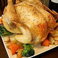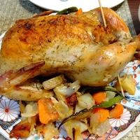 小さめの丸鶏でしたが、焼く1時間前に冷蔵庫から出して常温に戻し、一般的なオーブンレンジのオーブンでアルミホイルをかけて200℃で60分→アルミホイルを外して様子を見ながら40分焼きました。