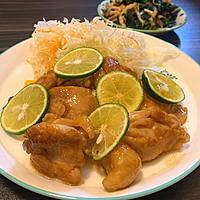 いつもは鶏皮を剥がして調理しますが、皮ありで作りました。照り焼き味にすだちの爽快な酸味がとても美味しかったです。