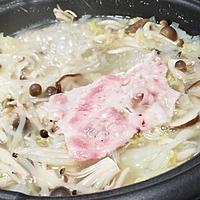 具材を入れる前に洗っておいたお米を入れその上に白菜、キノコを入れ白菜が柔らかくなるまで火にかけその間お米も炊き上がり、最後にお肉を入れました。
