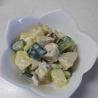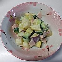 ハムの代わりにサラダチキンを入れました。オシャレなポテトサラダが完成。美味しかったです✨さつまいもの甘さとサラダチキンの食感が良かった☺️