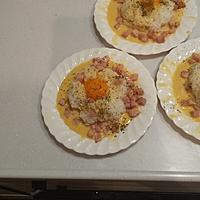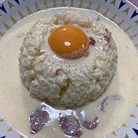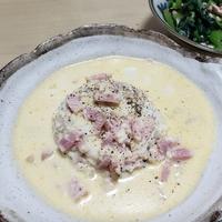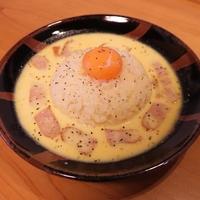 カルボナーラソースをたっぷりかけた、簡単カルボナーラライスのご紹介です。卵黄と混ぜて召し上がっていただくと、濃厚でとてもおいしいですよ。簡単にお作りいただけますので、この機会にぜひ作ってみてくださいね。