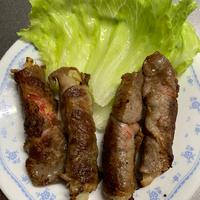 - 2 豚バラ肉で1と紅生姜を巻き、塩こしょうをふります。