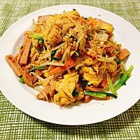 スパムは、少し焦がすと香ばしくなります。今回はかまぼこを入れて、色をつけました❗️