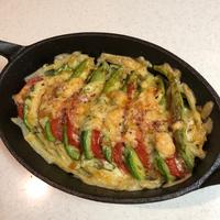 平たい耐熱皿がなかったので、フライパンでジャガイモを少し焼いた後、アルミホイルを敷いて魚焼きグリルで作りました。