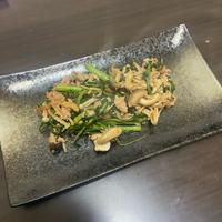 - 4 1、ツナ油漬けを加えて春菊がしんなりするまで中火で炒め(A)を加えて炒め合わせ味がなじんだら火から下ろします。