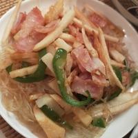 筍は水煮ヤングコーン7本・ベーコンはハム1P・春雨30・調味料そのまま。オイスターだけの味付けなのに美味しく簡単、次は筍で作ろっと✏️