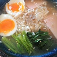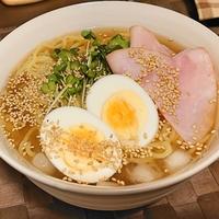 2人前を倍量で作りました。塩の代わりに昆布茶で味の深みをアップ。醤油ラーメンですが醤油感はあまりなく出汁醤油を大さじ一杯プラスしてやっとちょうどいい冷たい醤油ラーメンになりました。具材は味玉、メンマ、チャーシューです。これをベースにちょうどいい醤油ラーメンや塩ラーメンに昇華できればいいかな。