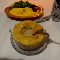 チキンクリームを入れたポットパイのご紹介です。焼けたパイを崩しながら具材を絡めて食べるポットパイは、熱々で、見た目にも楽しい一品です。特別な日やおもてなしにもぴったりです。冷凍パイシートを使えば意外と簡単ですよ。ぜひ作ってみてくださいね。