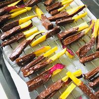 さつまいものチョコレートスティックはいかがでしょうか。カリッと揚げたさつまいもにチョコレートをコーティングした一品です。今回は仕上げにチョコスプレーをかけましたが、お好みのデコレーションでアレンジしてみてくださいね。