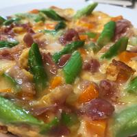 家にある野菜で何度もリピ。真ん中あたりいつまでも火が入らなくてずーっとガスにかけてたので底はかたくなってしまいました(笑)。今日はアスパラ、じゃがいも、ベーコン、玉ねぎ。