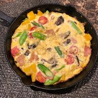 スキレットで作る、野菜をたくさん食べられるオムレツです。今回はスキレットを使用しましたが、普通のフライパンでも作れます。 パーティの時や食卓にもう一品欲しい時、野菜を食べたい時などに最適です。 冷蔵庫に余ってしまった野菜を加えるなど、お好みでアレンジしてみて下さい。