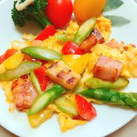 - 4 フライパンに1を入れ炒め、脂が出たらパプリカ、アスパラガスを加えて中火でサッと炒めます。